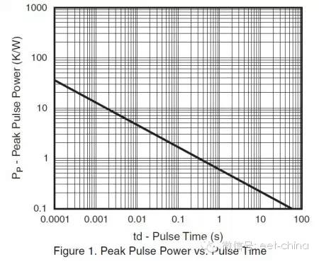 典型的脈沖持續(xù)時(shí)間Tp為1MS,當(dāng)施加到瞬態(tài)電壓抑制二極管上的脈沖時(shí)間tp 比標(biāo)準(zhǔn)脈沖時(shí)間短時(shí),其脈沖峰值功率將隨tp 的縮短而增加。