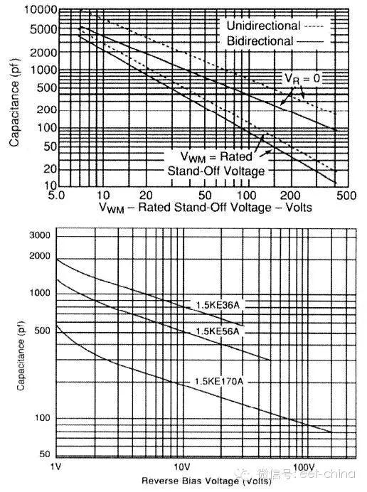 TVS的電容由硅片的面積和偏置電壓來(lái)決定,電容在零偏情況下,隨偏置電壓的增加,該電容值呈下降趨勢(shì)。電容的大小會(huì)影響TVS器件的響應(yīng)時(shí)間。